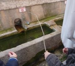 Nous sommes passés derrière la Médiathèque, puis devant la boulangerie, nous avons traversé, revu la banque, le magasin de jouets et nous avons passé un long moment devant le lavoir pour regarder l'eau couler dans les 3 petits bassins... (Marie nous a montré l'ombre de sa main dans l'eau. Et Arthur a trouvé un bâton qui faisait canne à pêche !)puis devant la boulangerie qui avait mis en vitrine des œufs en chocolat !!